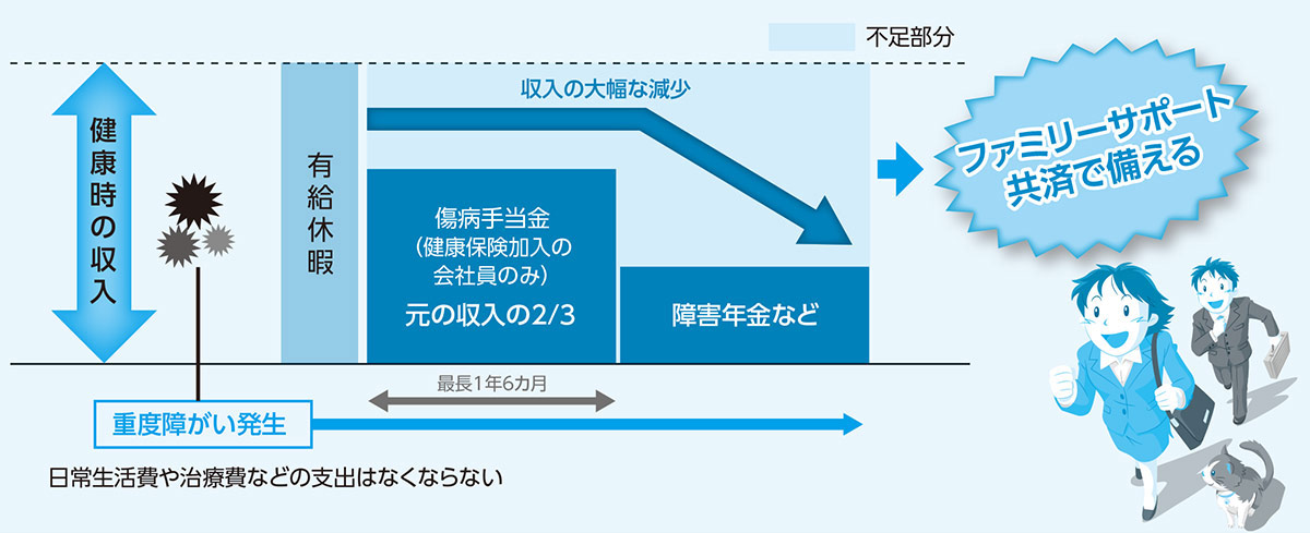 重度障がいで働けなくなると、治療費や生活費などたくさんお金がかかって家族に負担をかけてしまいますが、ファミリーサポート共済はワンコインで必要最低限の保障が備えられて、安心できました。