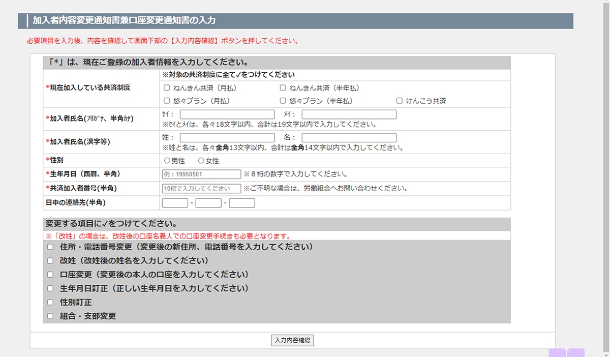 - 変更・訂正できる項目は 「住所・電話番号、姓、口座、生年月日、性別、組合支部」です。