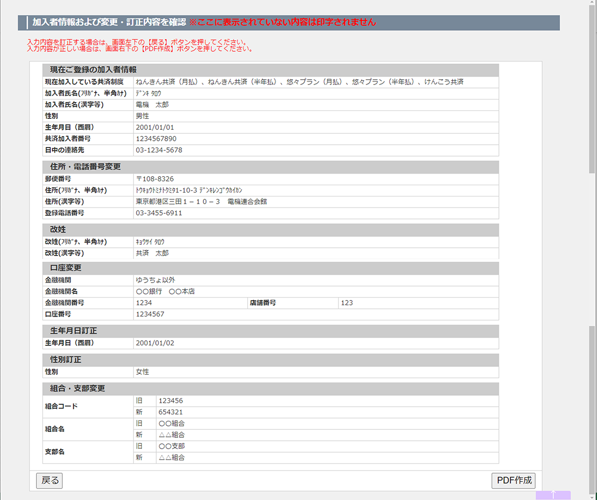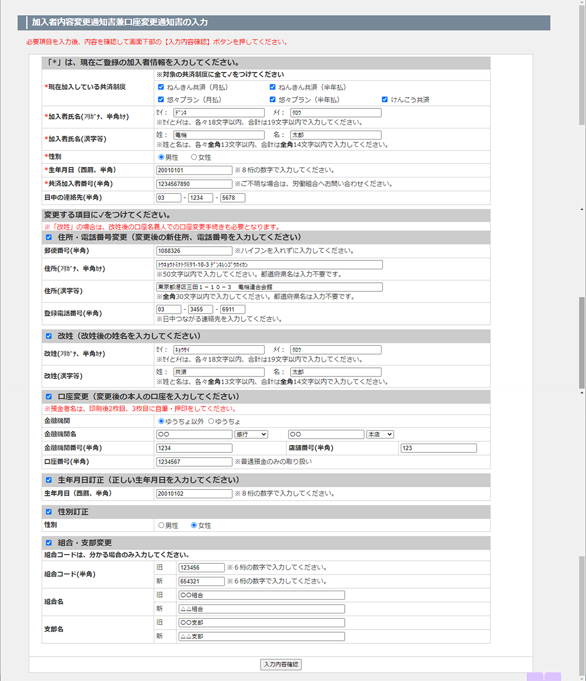 入力例は「住所・電話番号変更、改姓、口座変更、生年月日訂正、性別訂正、組合支部変更」にすべてチェックをつけた場合の表示となります。
