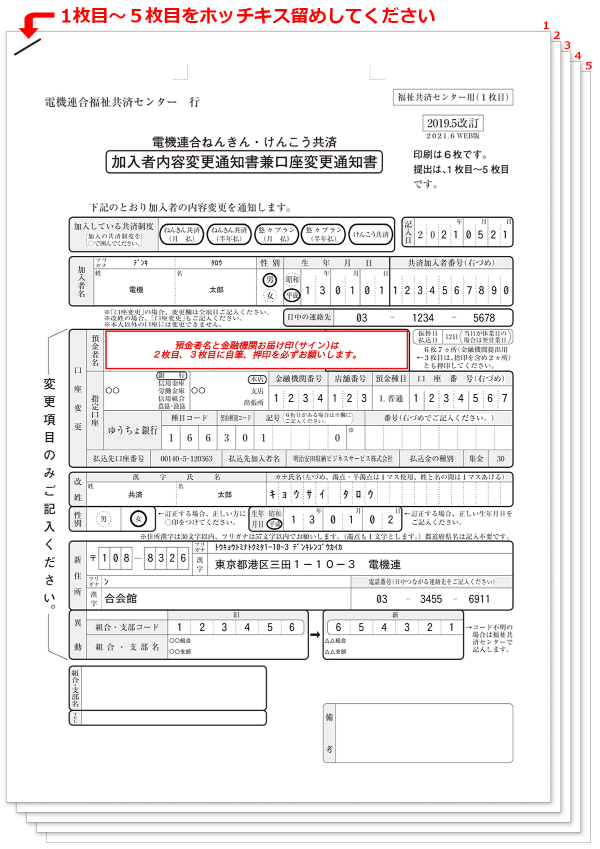 所属組合ご担当者様へ1~5枚目の用紙をホッチキス留めしてご提出ください