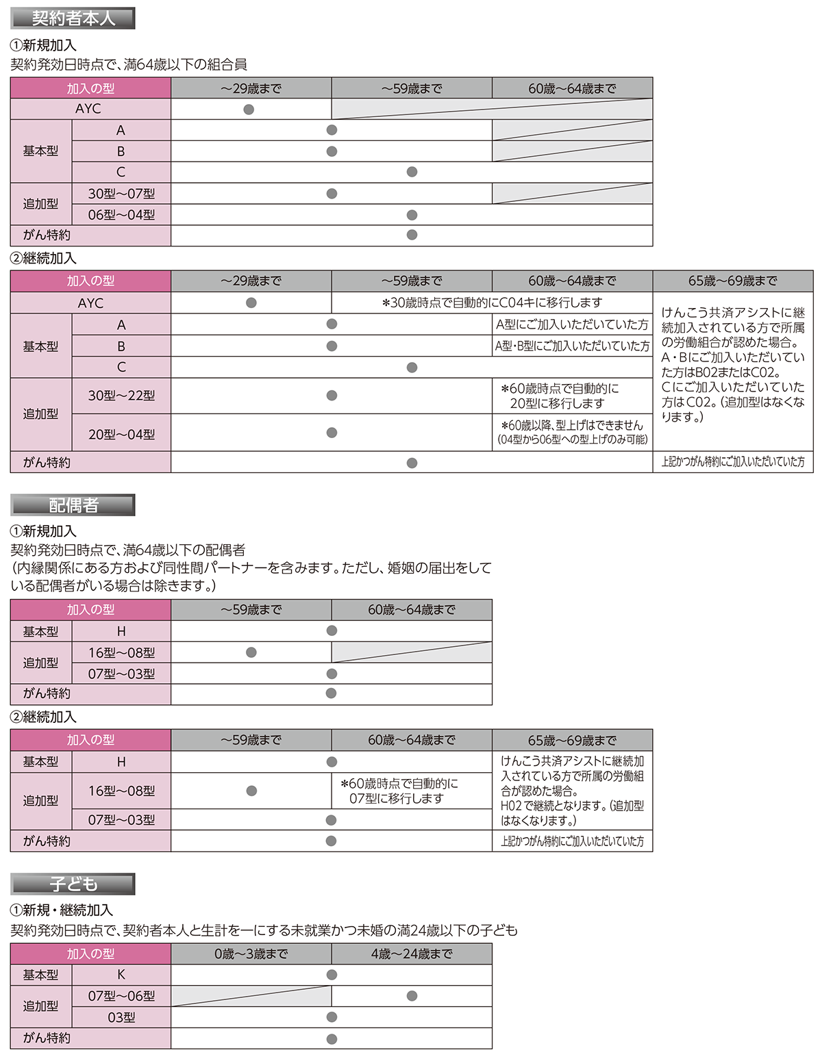 組合員であれば、加入できます。但し、契約発効日現在、満60〜満64歳の方は新規加入できる「契約の型」が限定されます。(参照Q&Aあり)